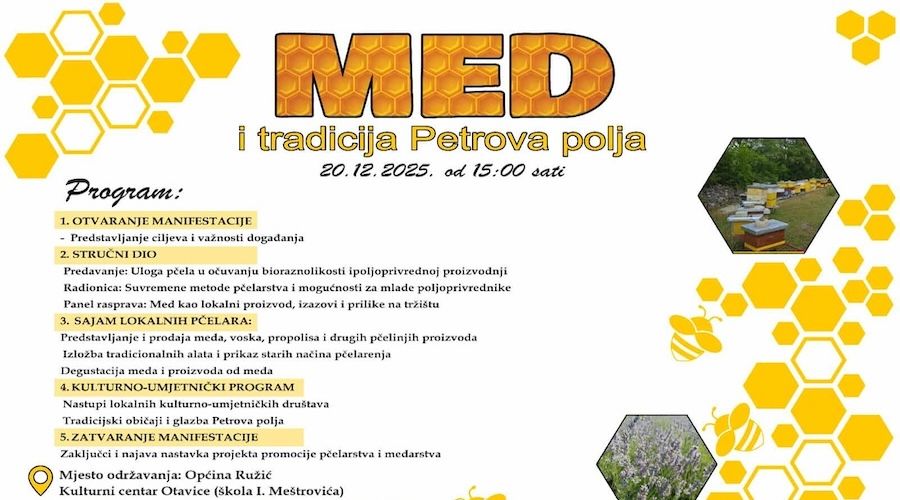 Općina Ružić poziva sve OPG-ove, udruge, proizvođače meda i ostalih pčelinjih proizvoda na sudjelovanje na gospodarskom sajmu "Med i tradicija Petrova polja - promocija pčelarstva i medarstva" koji će se održati u subotu, 20. prosinca 2025. godine od 15:00 sati u školi u Otavicama, Općina Ružić.